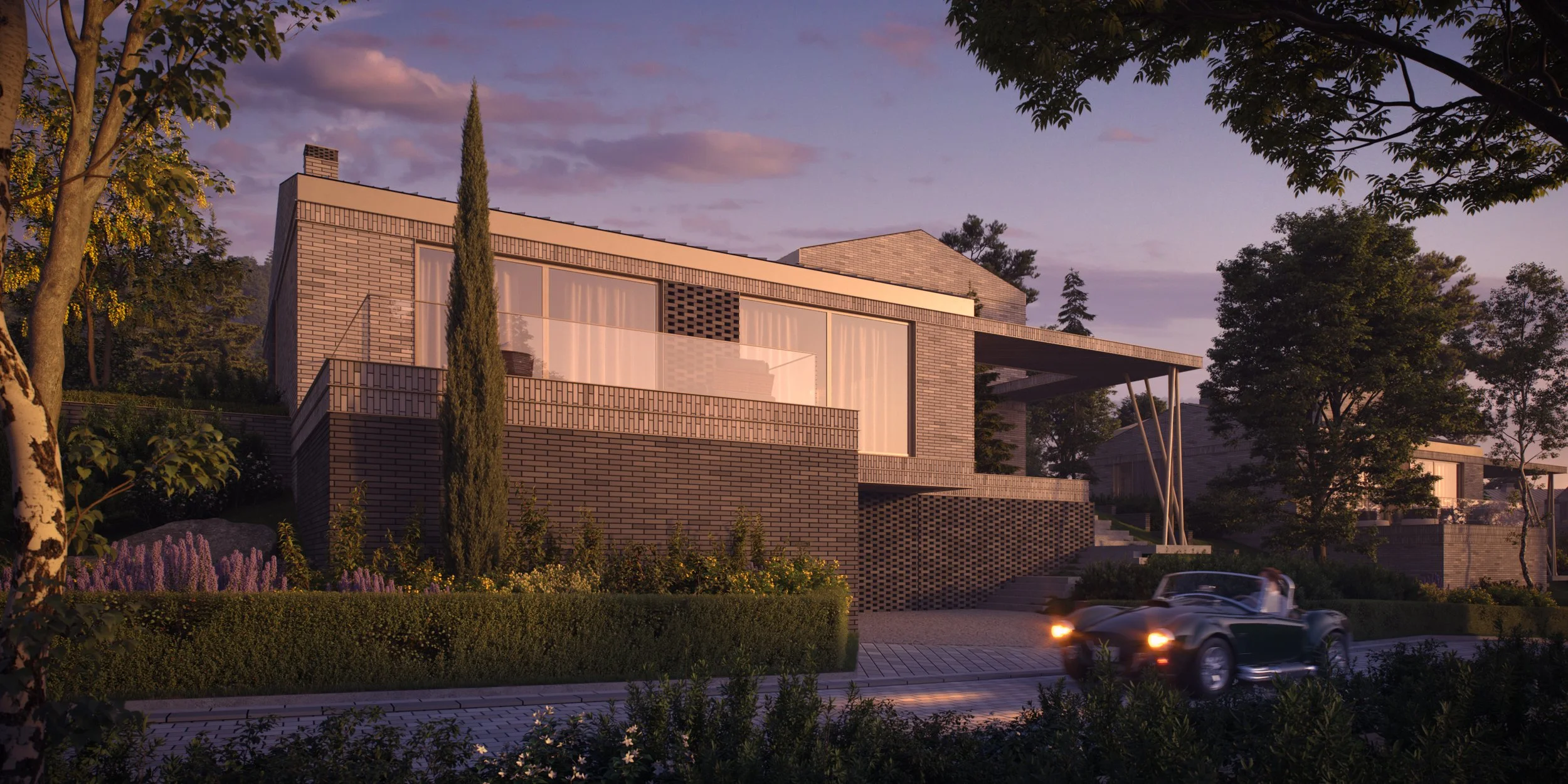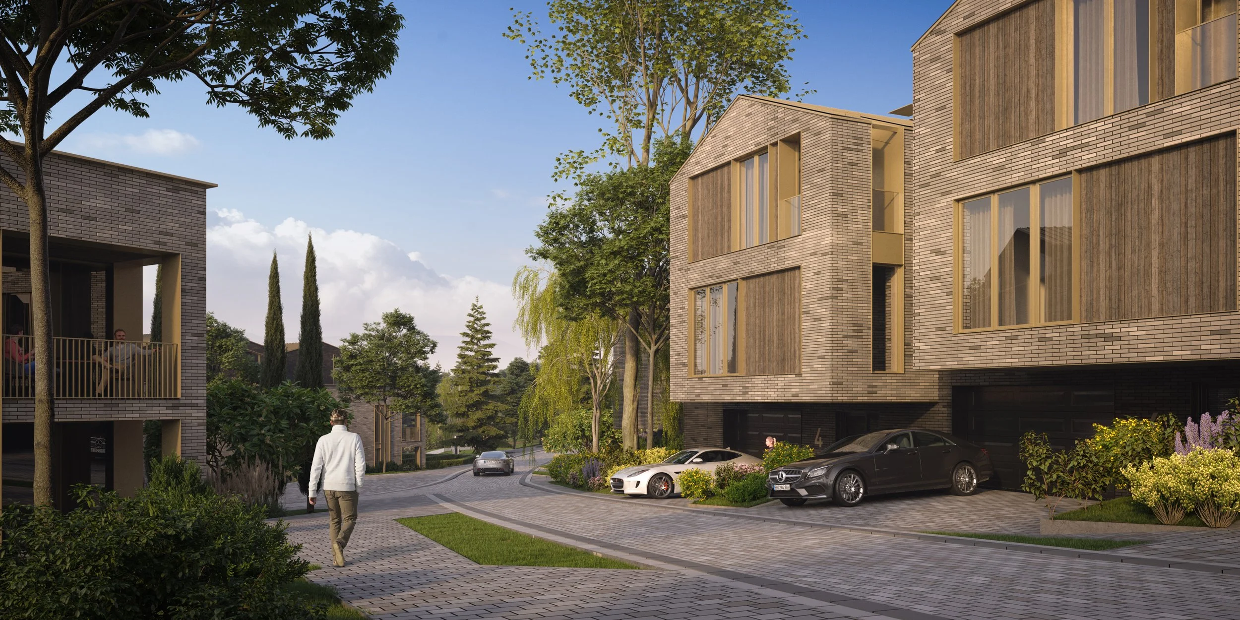 The residential structure includes 3 luxury houses, 3 residential buildings, 28 standalone houses, 12 twin houses, and 43 row houses. Each home benefits from a private yard framed by planting. Brick façades define a consistent and durable architectural character.