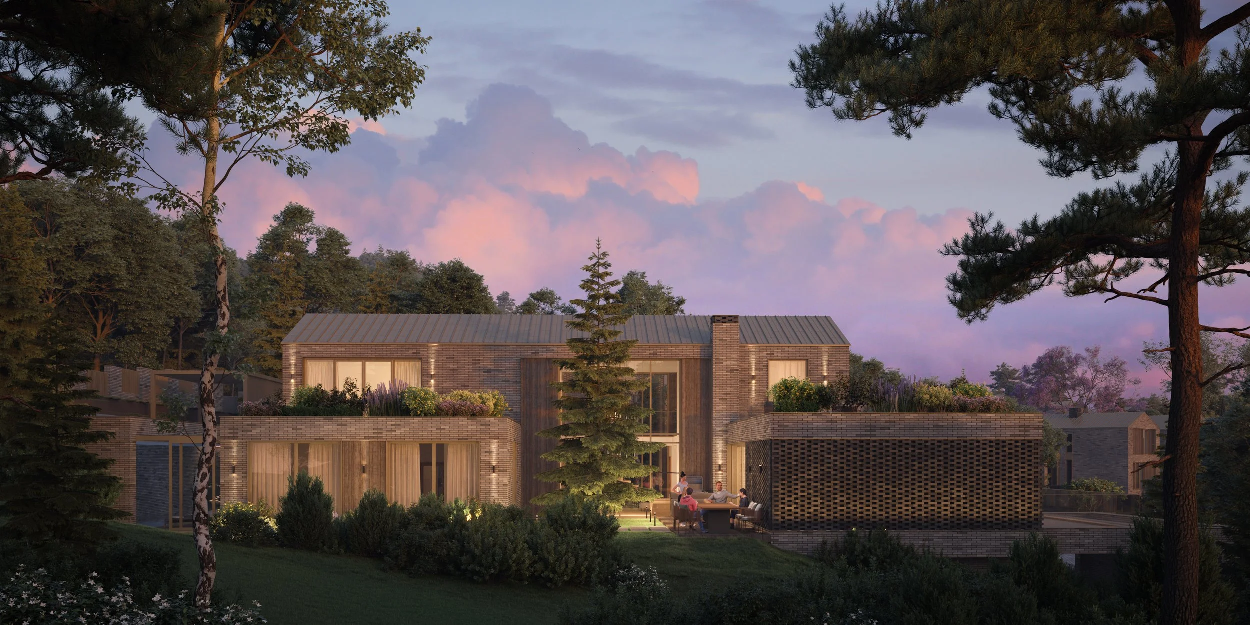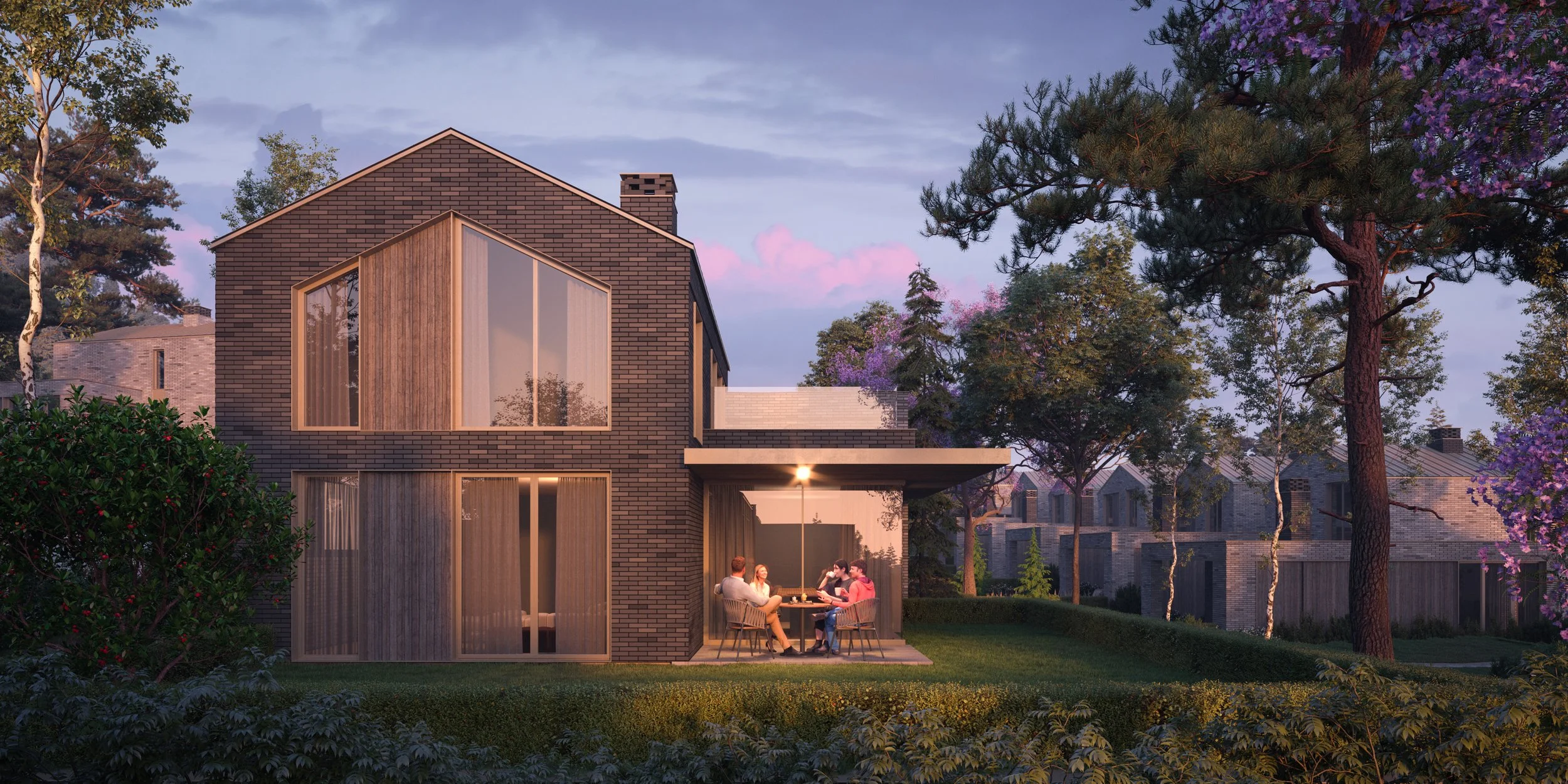 The masterplan maintains a balanced density without reaching the maximum allowable development parameters. Building placement and planting provide adequate distance between homes and a clear distinction between private and shared spaces. Amenities are distributed across the site to support daily use and social interaction while maintaining a consistent living standard across the complex.