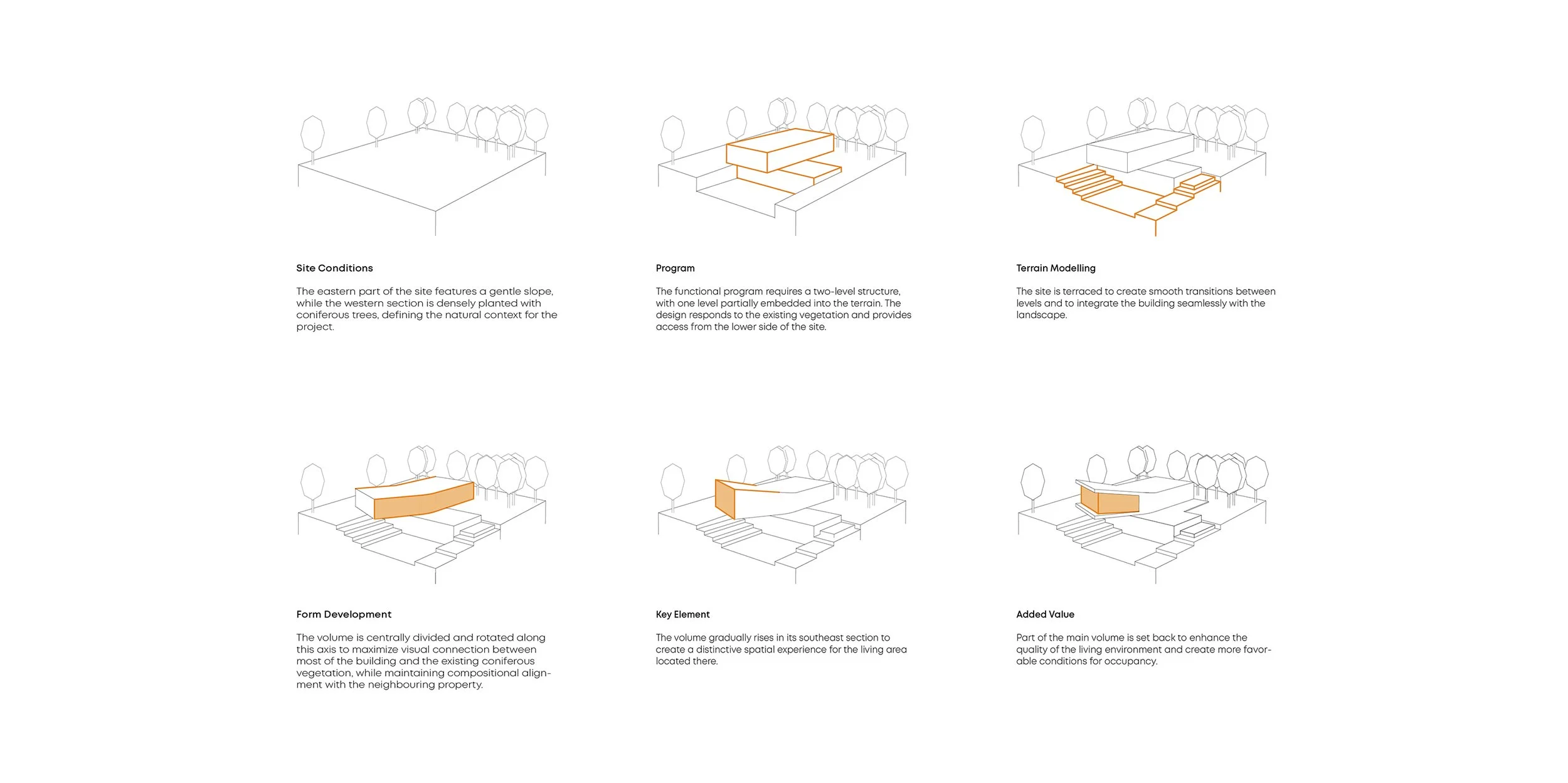 The design incorporates innovative energy-efficient solutions, supporting long-term performance and reduced operational costs. Conceived as a standalone unit, the house possesses a unique architectural expression while maintaining cohesion within the complex through the use of similar façade materials.