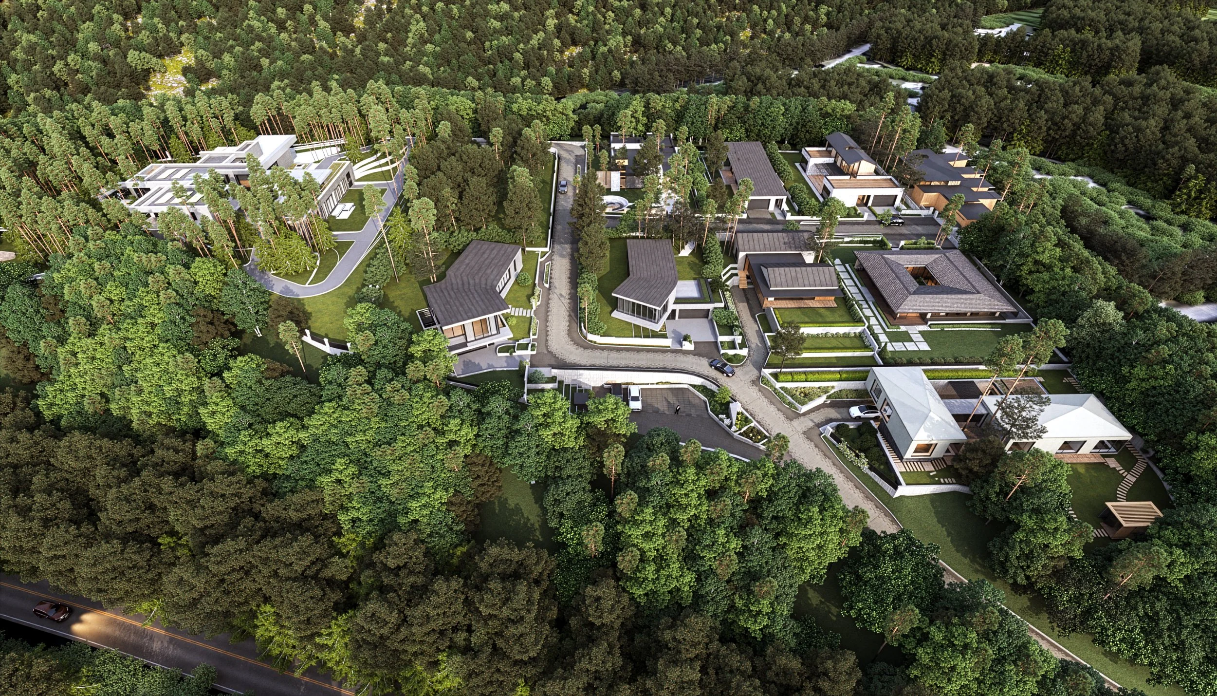 House /03, The Hovering House, sits elegantly within the sloped terrain. The lower embedded volume houses the garage, storage, laundry, and staff quarters with an English courtyard that allows natural light to penetrate the ground floor. The upper volume contains both day and night zones, featuring open-plan living spaces, a large dining area, and bedrooms with en-suite bathrooms. Verandas and terraces expand the living areas outward, reinforcing the connection between interiors and forest surroundings. Strategic roof and façade openings allow daylight to reach deep into the plan, creating bright, airy interiors. Materiality combines natural wood, stone, and concrete to establish harmony with the site.