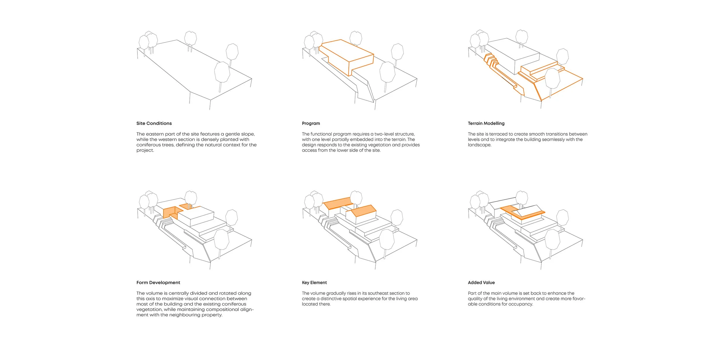 Among the residences, House /04, Dwelling House stands out with its balanced composition and refined spatial organization. The home is developed on two levels, with the lower one partially embedded into the sloped terrain. This allows functional placement of garages, storage, and service rooms below ground, while maintaining direct access to light-filled living spaces above.