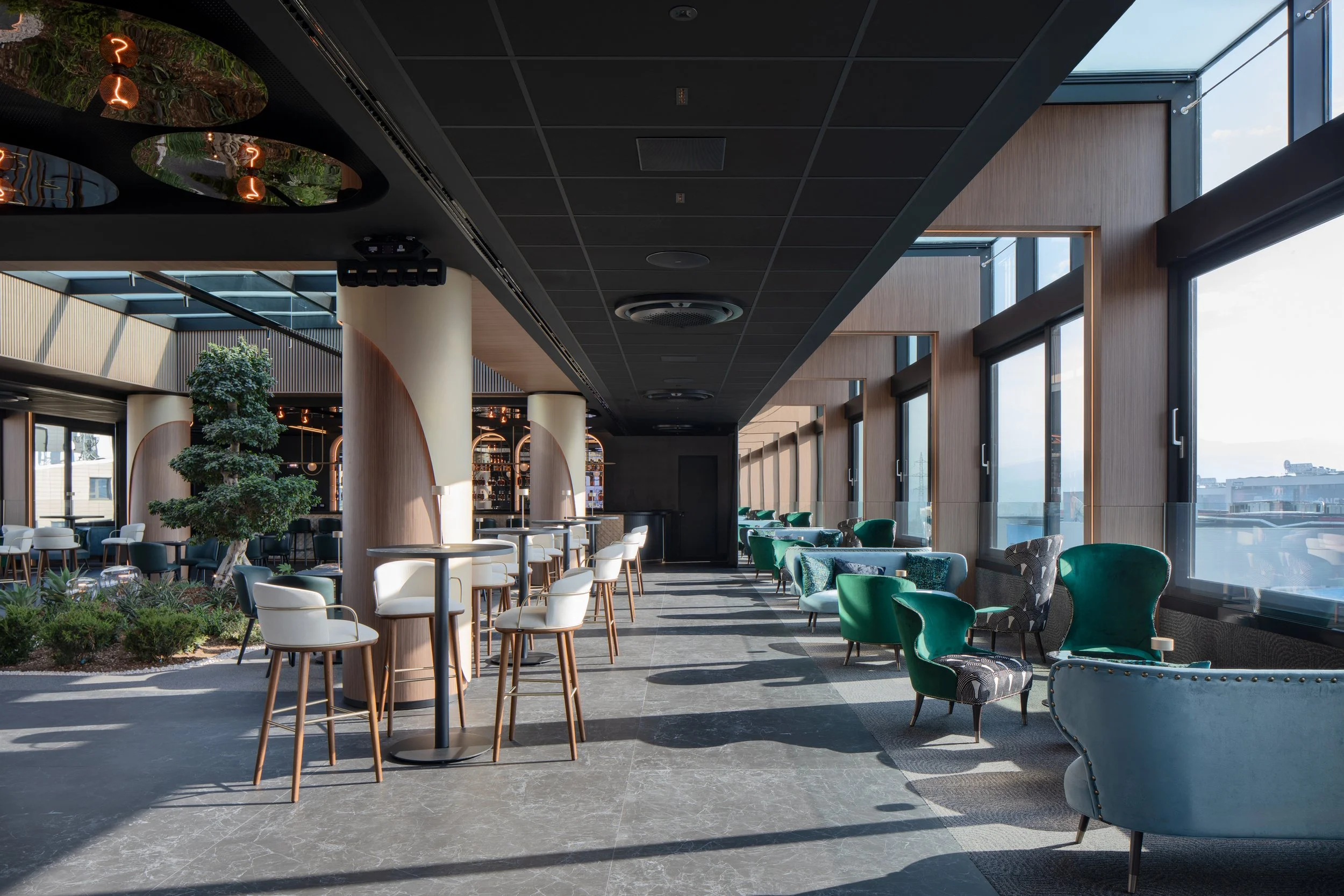 Lounge areas feature warm textures, panoramic windows, and reflective surfaces that enhance the sense of openness. Even the restrooms continue the immersive experience, with dark hallways, vibrant interiors, and infinity-effect mirrors creating moments of surprise.